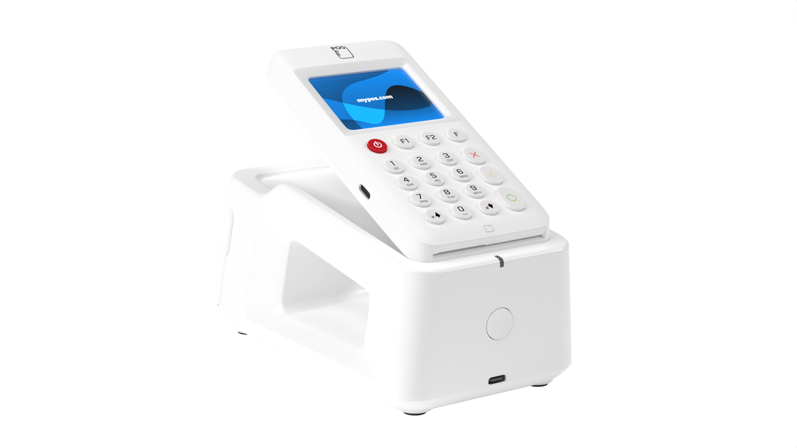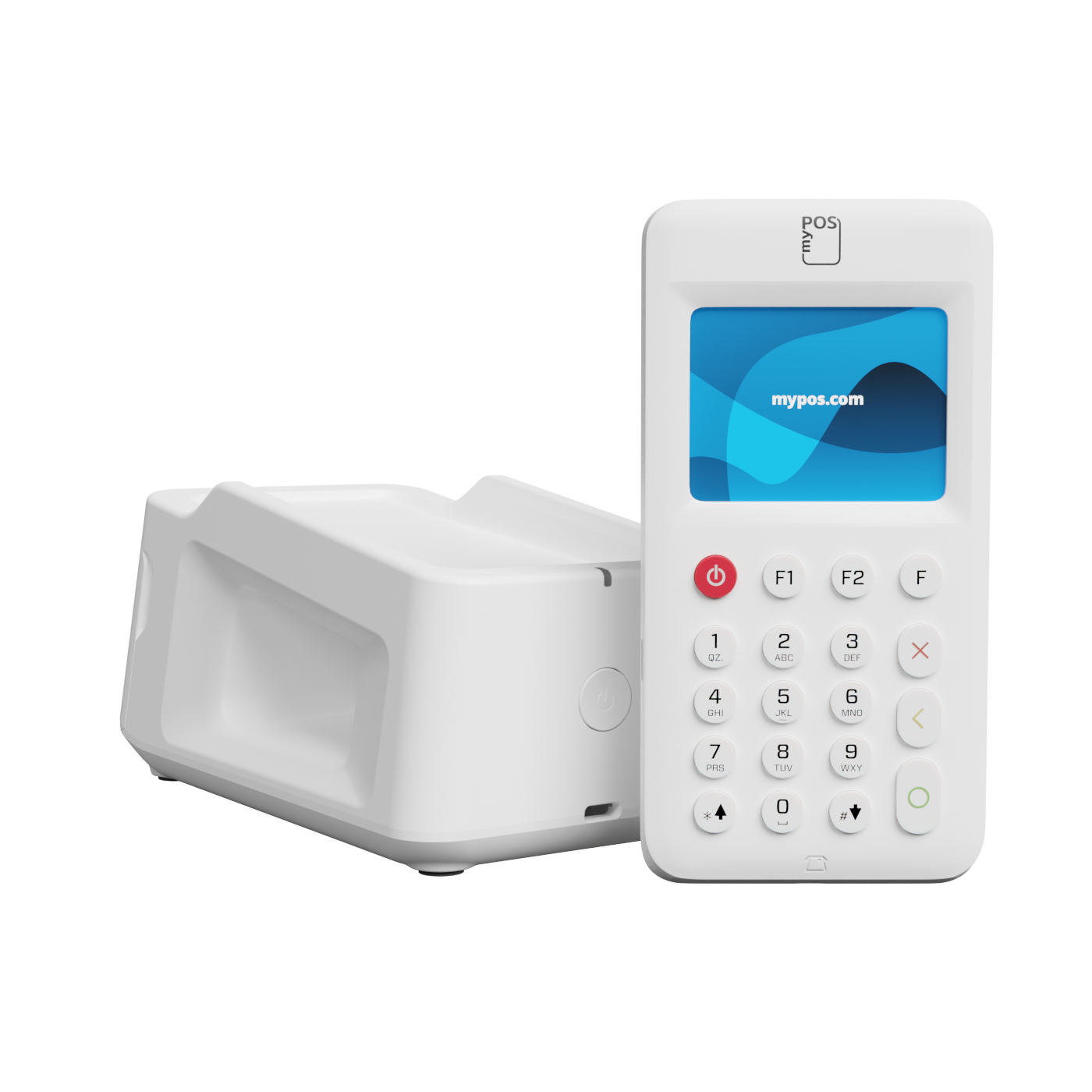 myPOS Go 2 package with the magnetic charging and printing base so you can charge the terminal and print receipts on the go.